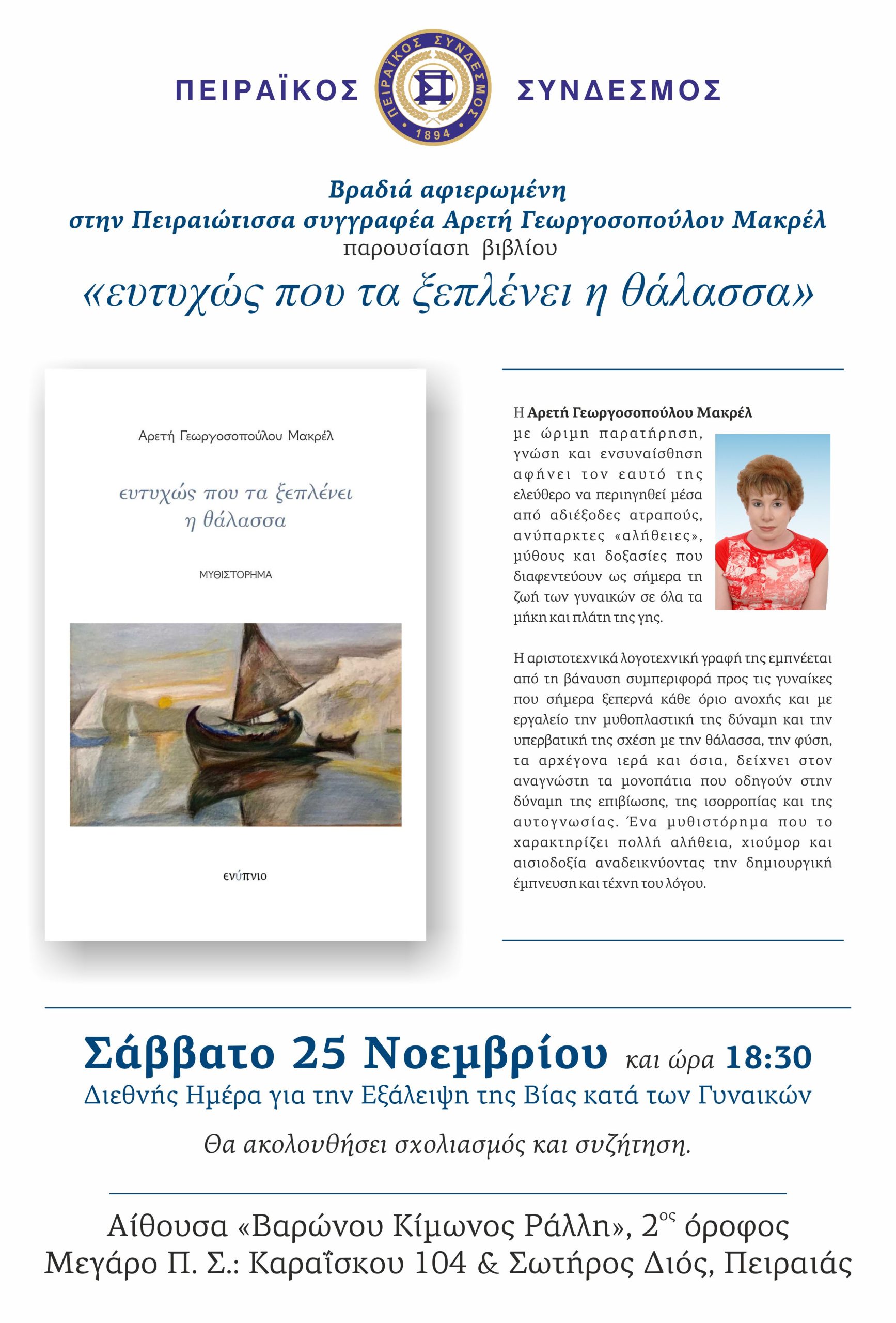 Post author:perasd Post published:November 21, 2023 Post category:Uncategorized Post comments:0 Comments Σάββατο 25 Νοεμβρίου και ώρα 18:30, στο πλαίσιο της Διεθνής Ημέρας για την εξάλειψη της βίας κατά των γυναικών, σας προσκαλούμε σε μια ημέρα αφιερωμένη στην Πειραιώτισσα συγγραφέα Αρετή Γεωργοσοπούλου – Μακρέλ! Leave a Reply Cancel replyCommentEnter your name or username to comment Enter your email address to comment Enter your website URL (optional) Save my name, email, and website in this browser for the next time I comment.