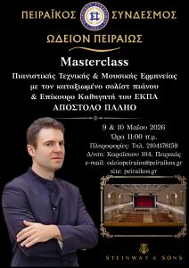 Ο καταξιωμένος σολίστ πιάνου Απόστολος Παληός, με διεθνή καλλιτεχνική παρουσία σε σημαντικές συναυλιακές αίθουσες, παιδαγωγός και επίκουρος καθηγητής στο Πανεπιστήμιο Αθηνών, διοργανώνει ένα εξειδικευμένο masterclass πιανιστικής τεχνικής και μουσικής ερμηνείας με πιάνο Steinway & Sons, 9 & 10 Μαΐου, στην αίθουσα εκδηλώσεων “Βαρώνου Κίμωνος Ράλλη” του Πειραϊκού Συνδέσμου (Καραΐσκου 104 & Σωτήρος Διός, 185 35 Πειραιάς).